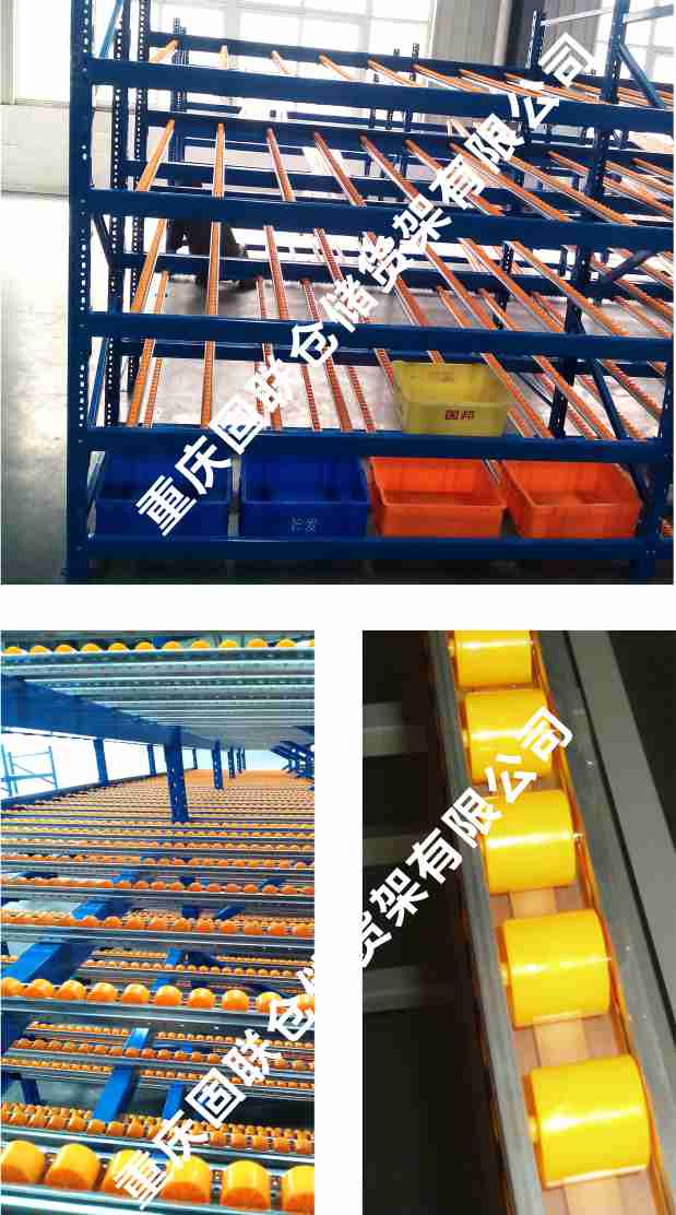 滾輪式料架簡稱流利架,是將貨物置于滾輪上,利用一邊通道存貨,另一邊通道取貨。料架朝出貨方向向下傾斜,貨物在重力作用下向下滑動?蓪崿F(xiàn)先進先出,并可實現(xiàn)一次補貨,多次揀貨。流利架存儲效率高,適合大量貨物的短期存放。